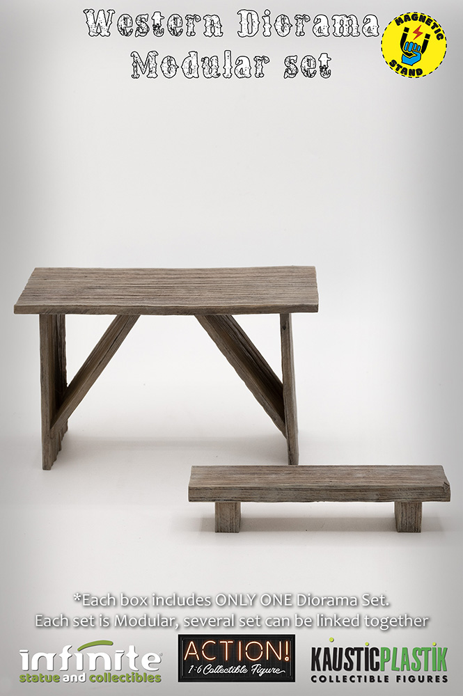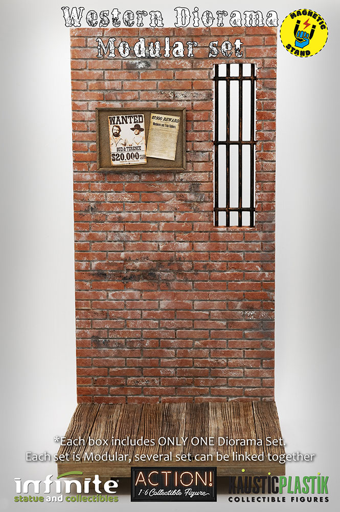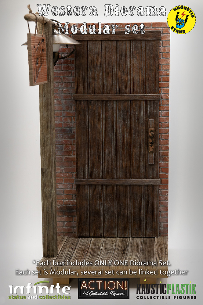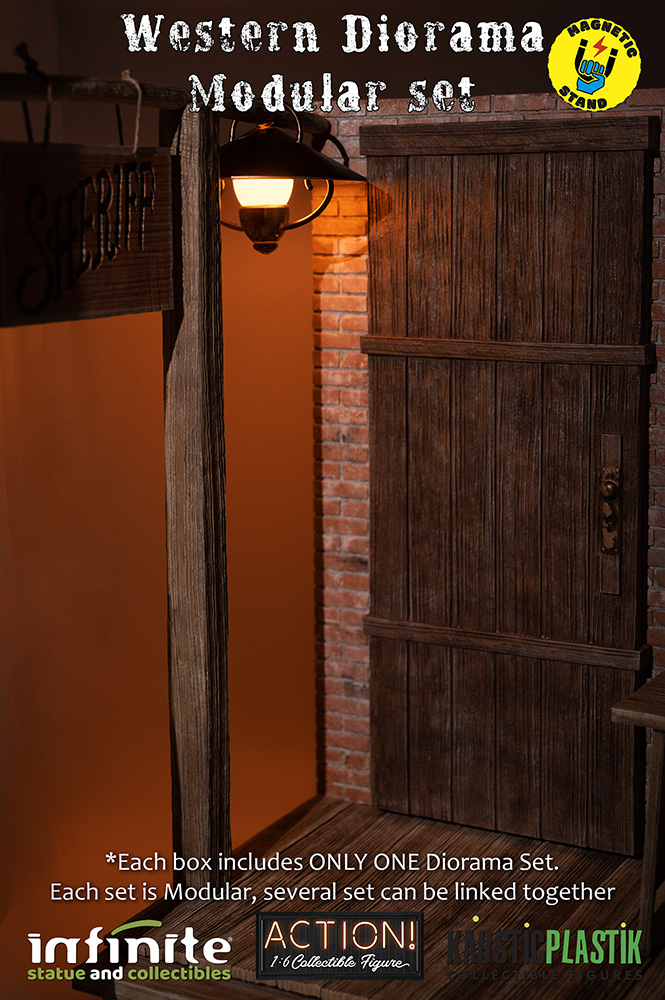 Da Infinite Statue & Collectibles e Kaustic Plastik un fantastico set diorama Western: Sheriff Resin Diorama. Il set diorama è totalmente modulare e include parti e vari accessori che, con un sistema di link esclusivo e unico, possono essere combinati a piacere per creare differenti location. Inoltre collezionando più sets e, collegandoli fra loro, si potrà rendere il diorama più grande e la scena Western completa.
