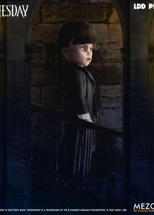 Dalla serie Tv di Netflix “Wednesday”, ecco Mercoledì Addams in versione Living Dead Dolls! La figura indossa l’uniforme della Nevermore Academy e ha 5 punti di articolazione.