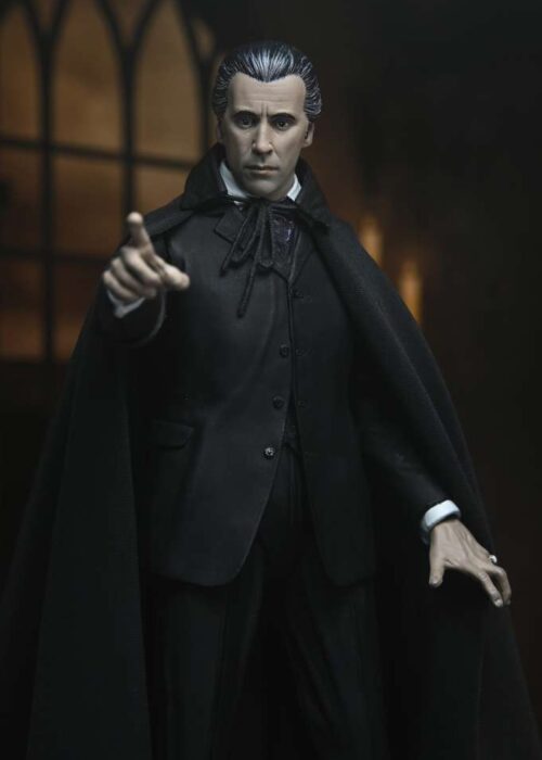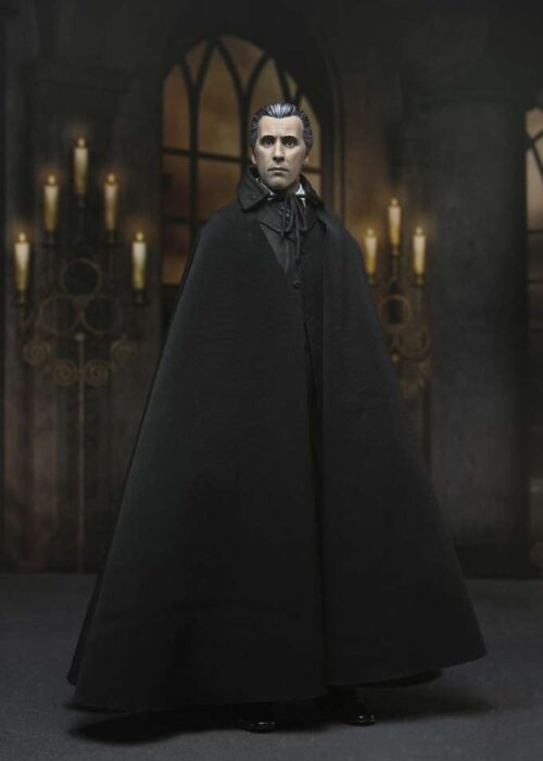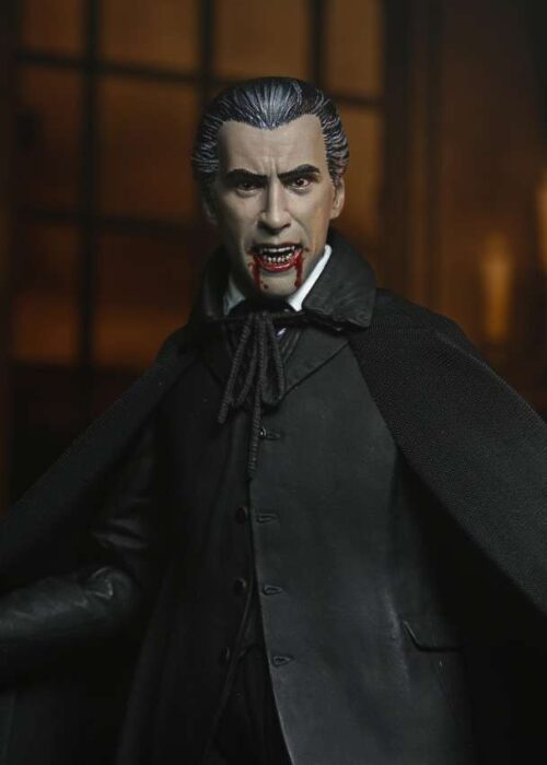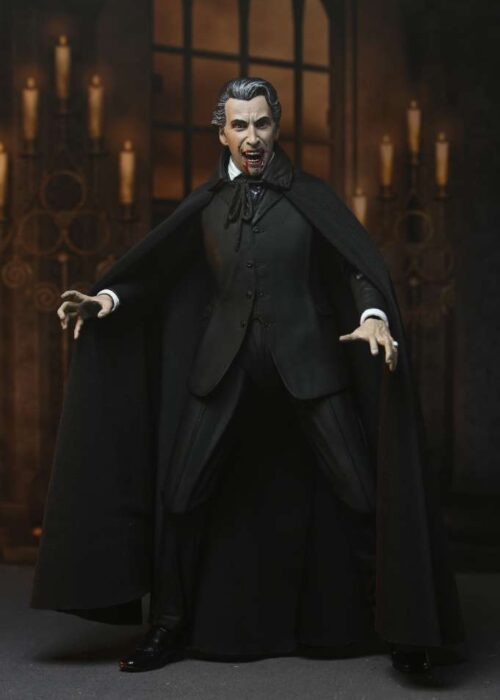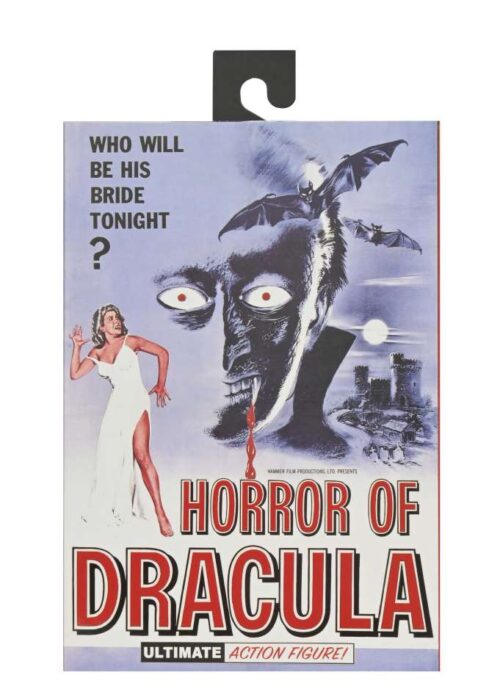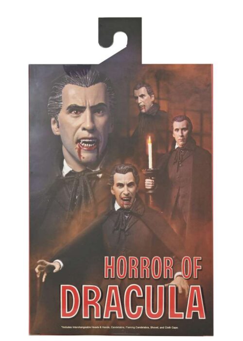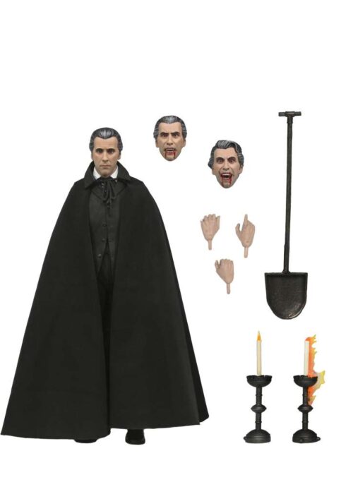 Neca presenta una nuova serie di action figures Ultimate dedicate alla leggendaria Hammer House of Horror! La prima uscita non poteva che essere l’indimenticabile Christopher Lee nei panni di Dracula, da “Dracula il Vampiro” del 1958! La figura ha ottimi dettagli e indossa un dettagliato mantello in vera stoffa. Inoltre nella scatola troverete mani e volti intercambiabili, dei candelabri e una pala.