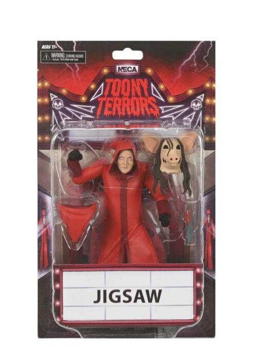 Nuova proposta di Neca per la serie Toony Terrors ispirata a “Saw”: ecco Jigsaw Killer con Red Robe! Nel box troverete anche una testa intercambiabile e una lama, oltre a uno sfondo da usare per creare le scene ispirate al film.