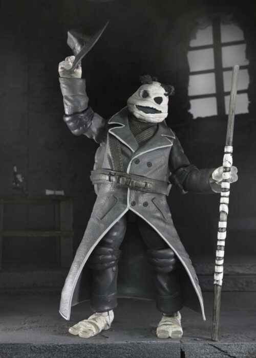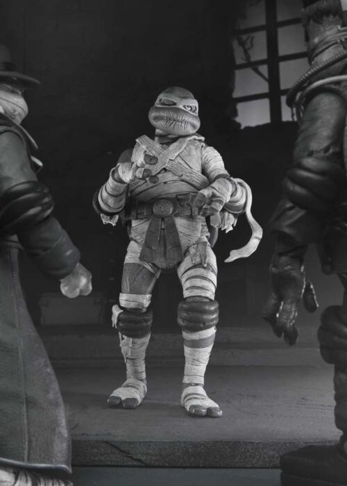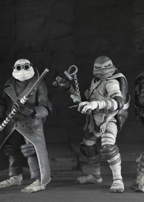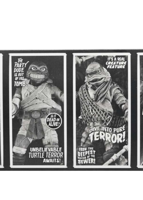 Nuova proposta di Neca per la serie Universal Monsters x Teenage Mutant Ninja Turtles! Questo 4-pack contiene le action figures in versione bianco e nero di: Raffaello nei panni di Frankenstein, Michelangelo nei panni della Mummia, Donatello nei panni dell’Uomo Invisibile e Leonardo nei panni del Mostro della Laguna Nera. Ogni figura è dotata di articolazioni e accessori.