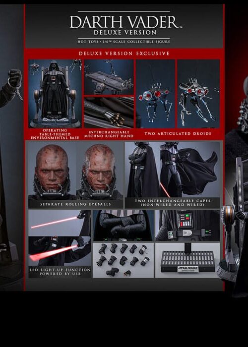Una volta eroico Cavaliere Jedi, la discesa di Anakin Skywalker nell’oscurità portò a un duello fatale con Obi-Wan Kenobi su Mustafar, dove fu devastantemente sconfitto e lasciato gravemente ferito e seriamente ustionato. Salvataggiato dall’Imperatore Palpatine, Anakin fu trasportato a Coruscant, dove subì un’intensa chirurgia ricostruttiva presso il Centro di Ricostruzione Chirurgica dell’Imperatore Palpatine, che lo incapsulò nella iconica armatura nera e nella tuta di supporto vitale, segnando la sua rinascita come Darth Vader.In celebrazione del 20° anniversario di Star Wars: Episodio III La vendetta dei Sith, Sideshow e Hot Toys sono orgogliosi di presentare la nuova figura da collezione Darth Vader (Versione Deluxe) in scala sesta, che cattura la scena classica della trasformazione di Anakin Skywalker nel temibile Signore dei Sith Darth Vader.