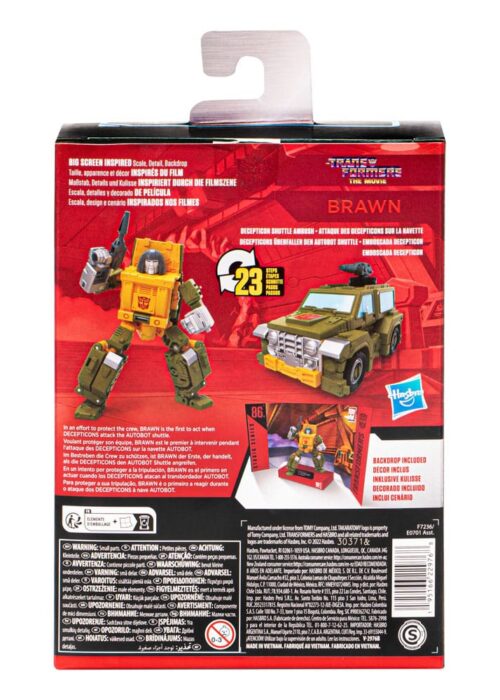 Porta l’epica azione dei film Transformers dal grande schermo nella tua collezione con l’action figure Transformers Studio Series Deluxe Class 86-22 Brawn, ispirata a The Transformers: The Movie! Nel tentativo di proteggere l’equipaggio, Brawn è il primo ad agire quando i Decepticon attaccano la navetta Autobot. I giocattoli della serie Transformers Studio sono action figure collezionabili per bambini e bambine di 8 anni che presentano dettagli e accessori ispirati al film. Converti l’action figure dalla modalità robot alla modalità fuoristrada in 23 passaggi e metti in posa il giocattolo Brawn nella scena di sfondo rimovibile Decepticon Shuttle Ambush inclusa. Le action figure Transformers per ragazzi e ragazze sono un ottimo regalo!